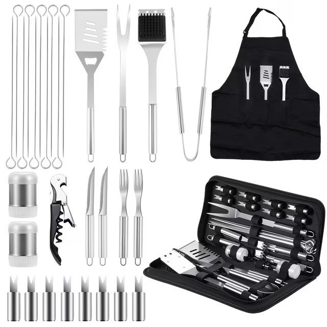 - Must-Have Essential BBQ Tools: This BBQ Grill Accessories set is ideal for barbecue enthusiasts. The 29-piece grill set includes all the essentials and convenient extras like a 3-in-1 waiter’s key and salt & pepper shakers, catering to all your condiment needs.